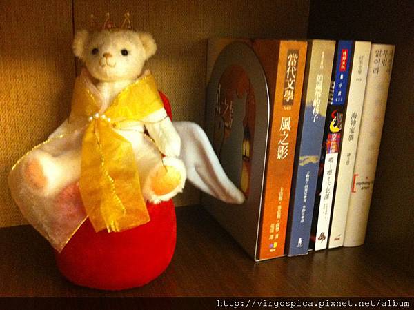 千公主熊跟書櫃特別適合。公主說放在這裡每天起床後就能看見她了。