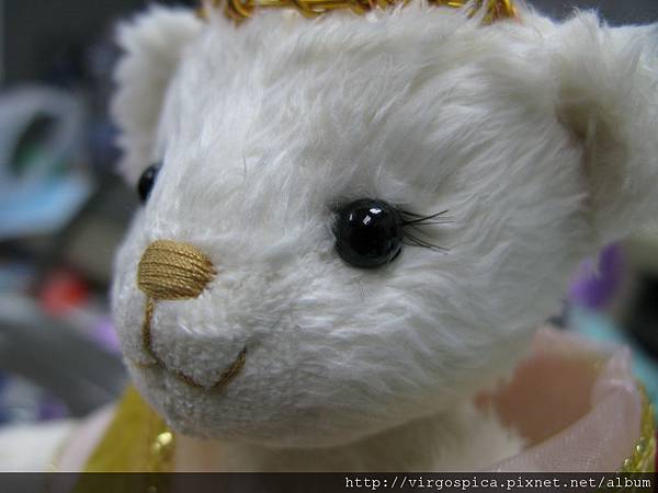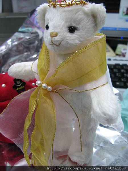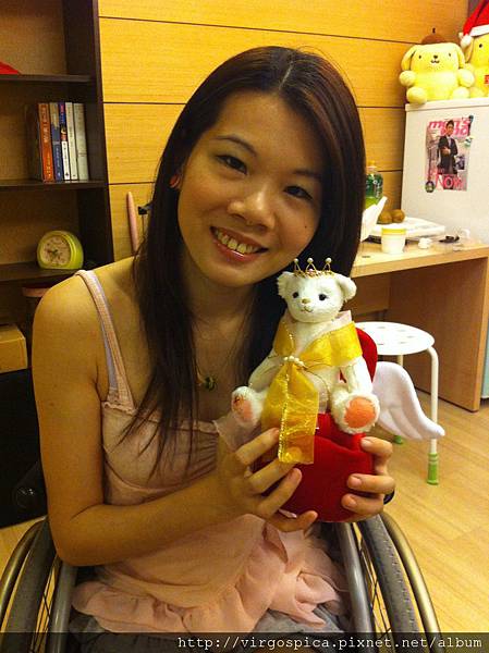 公主很喜歡熊熊。於是我請Jarlin替我製作公主熊。Jarlin做的熊有各種不同的臉狀,我選了一個秀氣的熊熊臉。大概告訴她要送給一個做輪椅的好朋友,希望有衣服跟輪椅,最好要閃亮亮的頭飾,熊的腳下要寫千公主,這樣才是獨一無二!